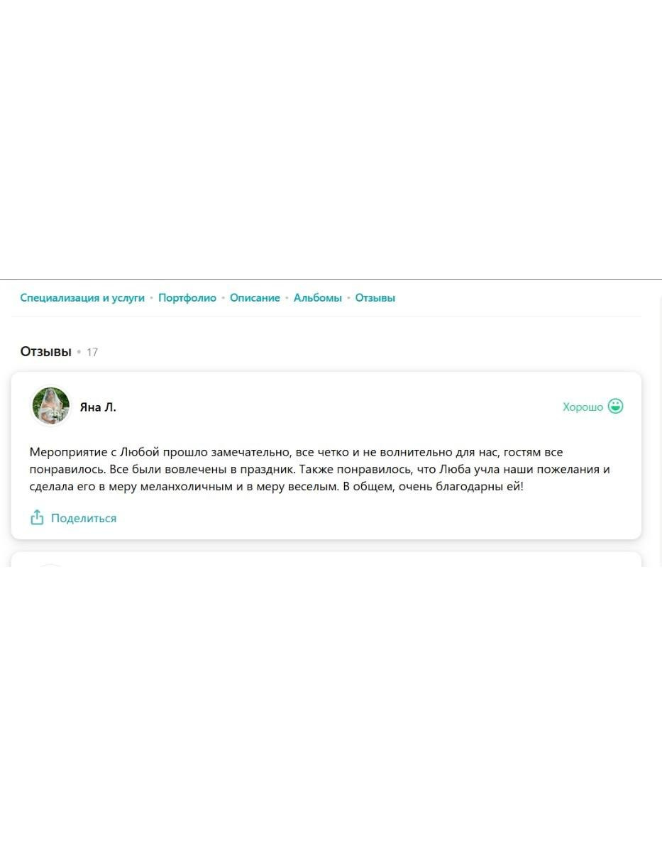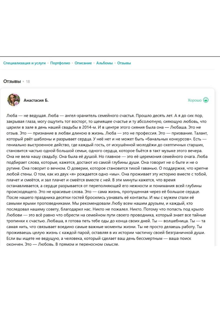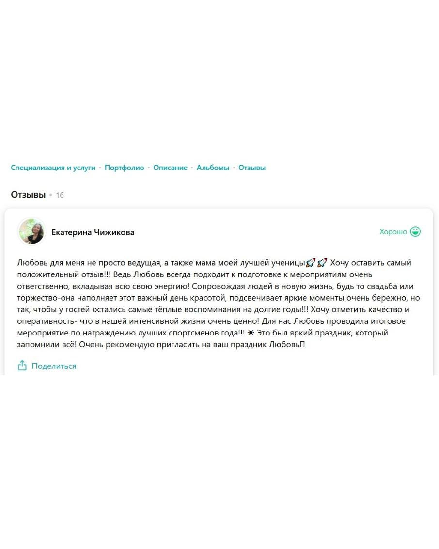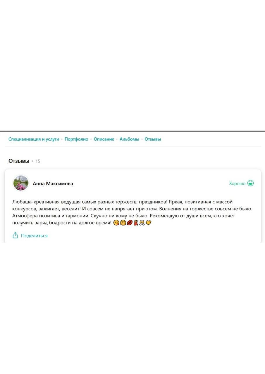 Я зажигательная ненавязчивая ведущая, принципом которой является не только искрометность и харизматичность, но и душевность, понимание и, конечно, тщательное планирование каждого праздника.