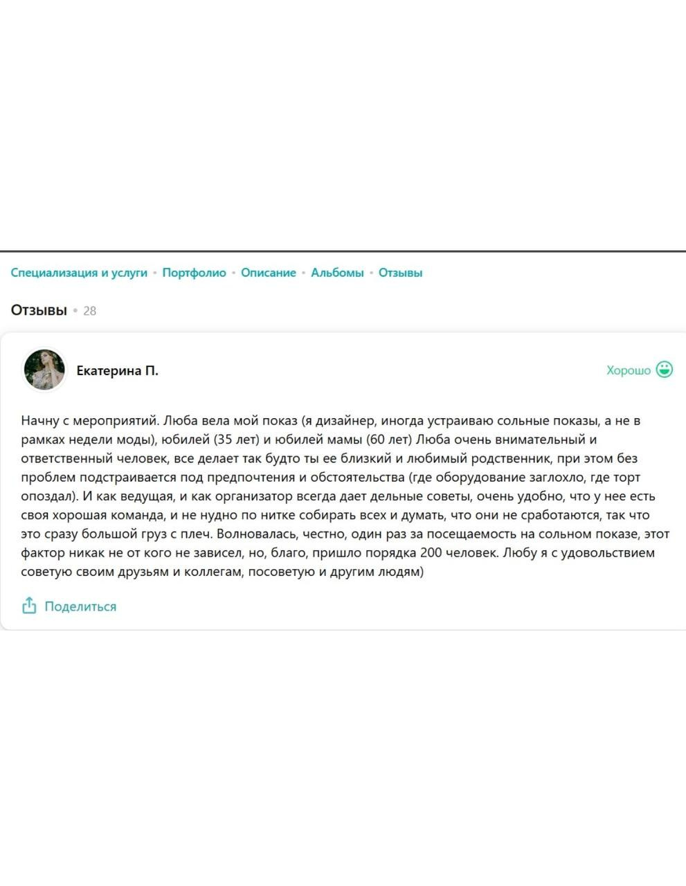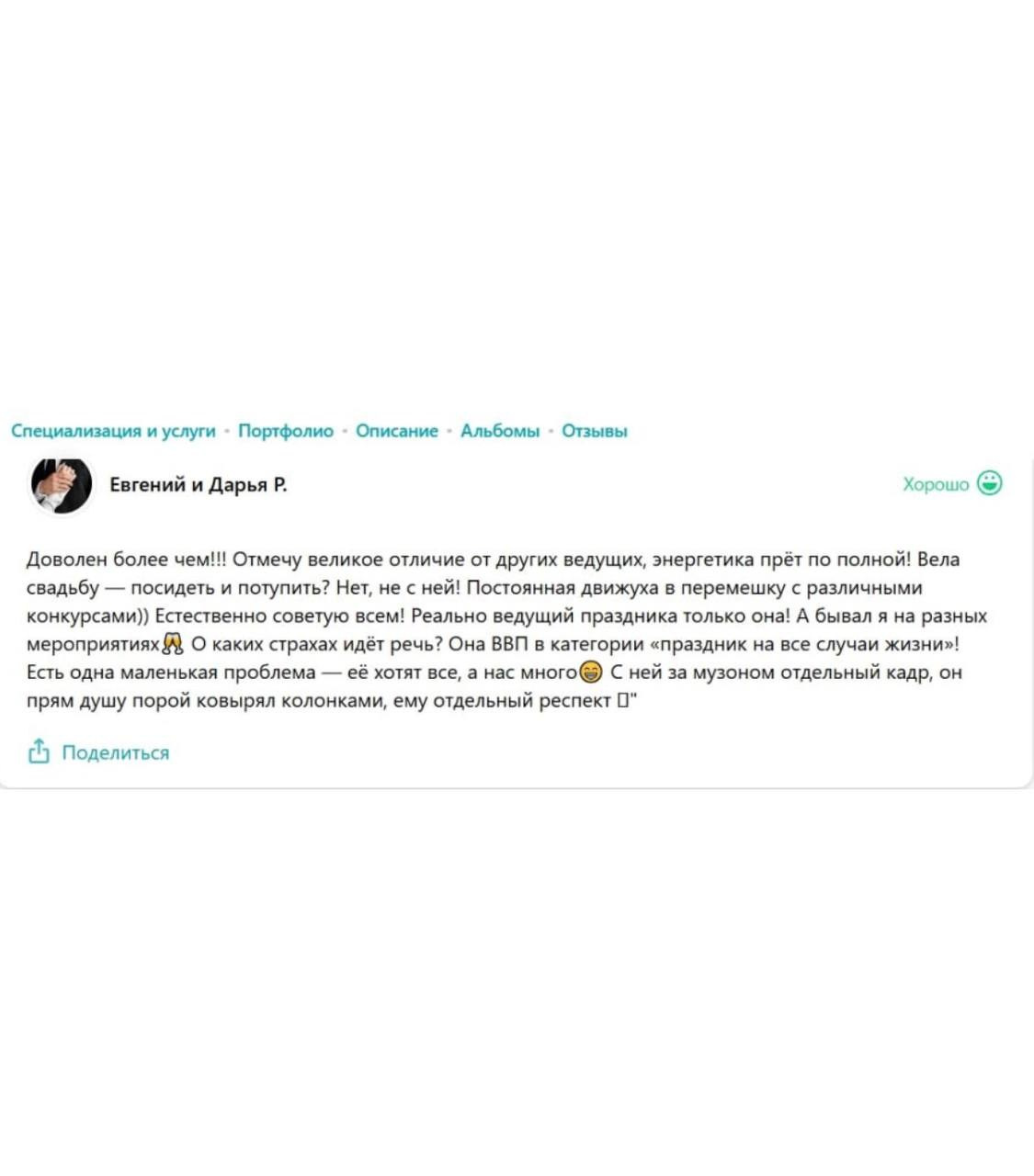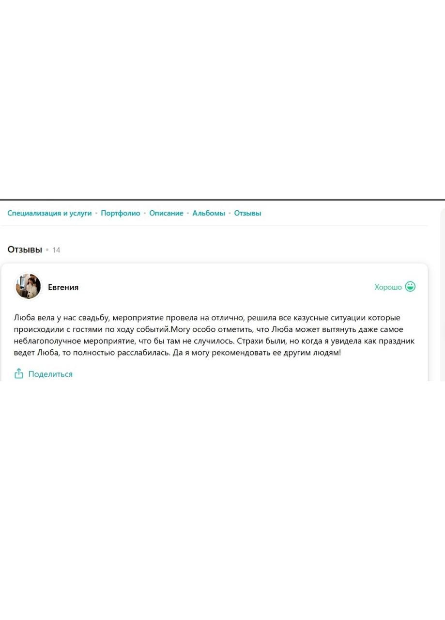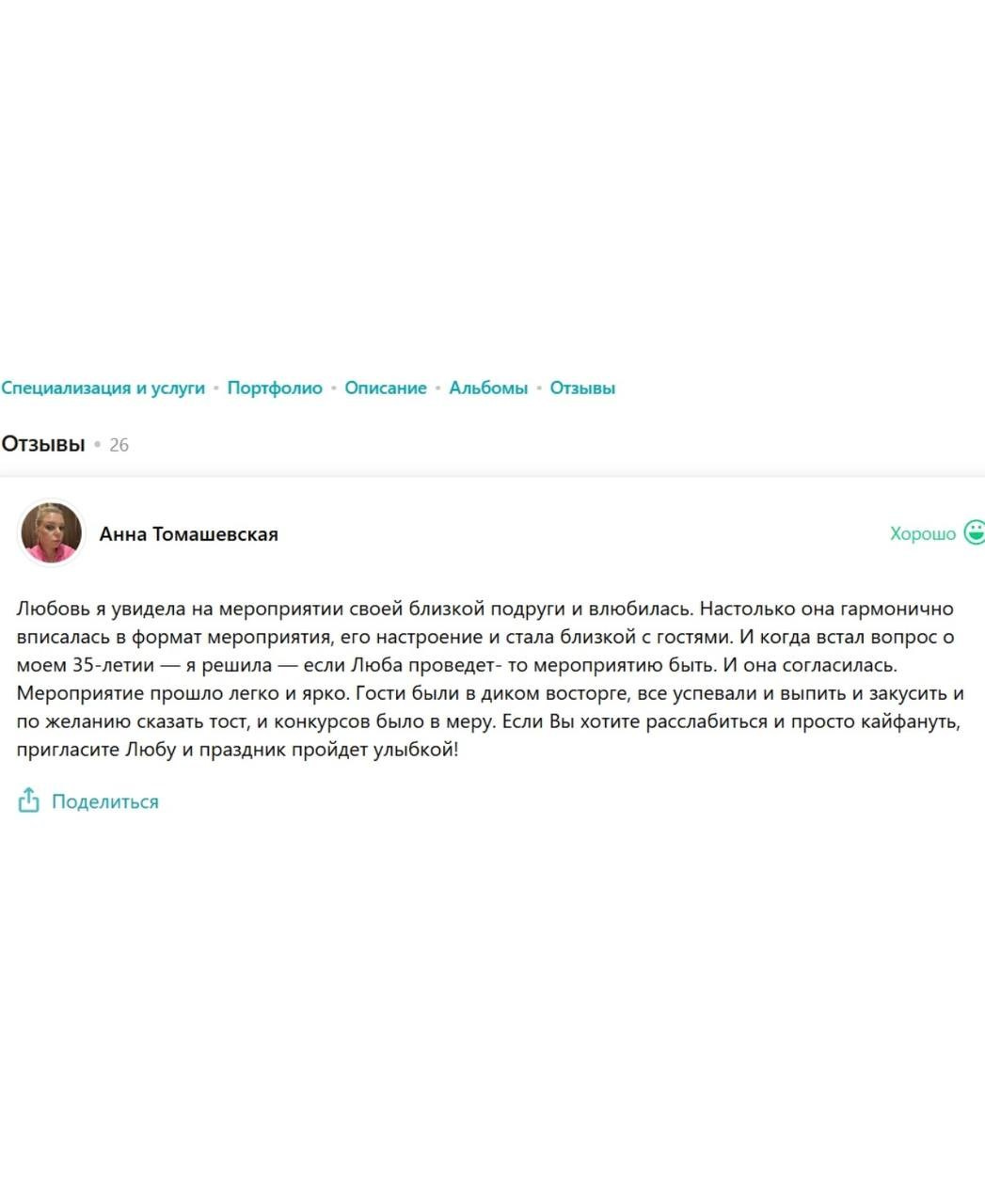 Я зажигательная ненавязчивая ведущая, принципом которой является не только искрометность и харизматичность, но и душевность, понимание и, конечно, тщательное планирование каждого праздника.