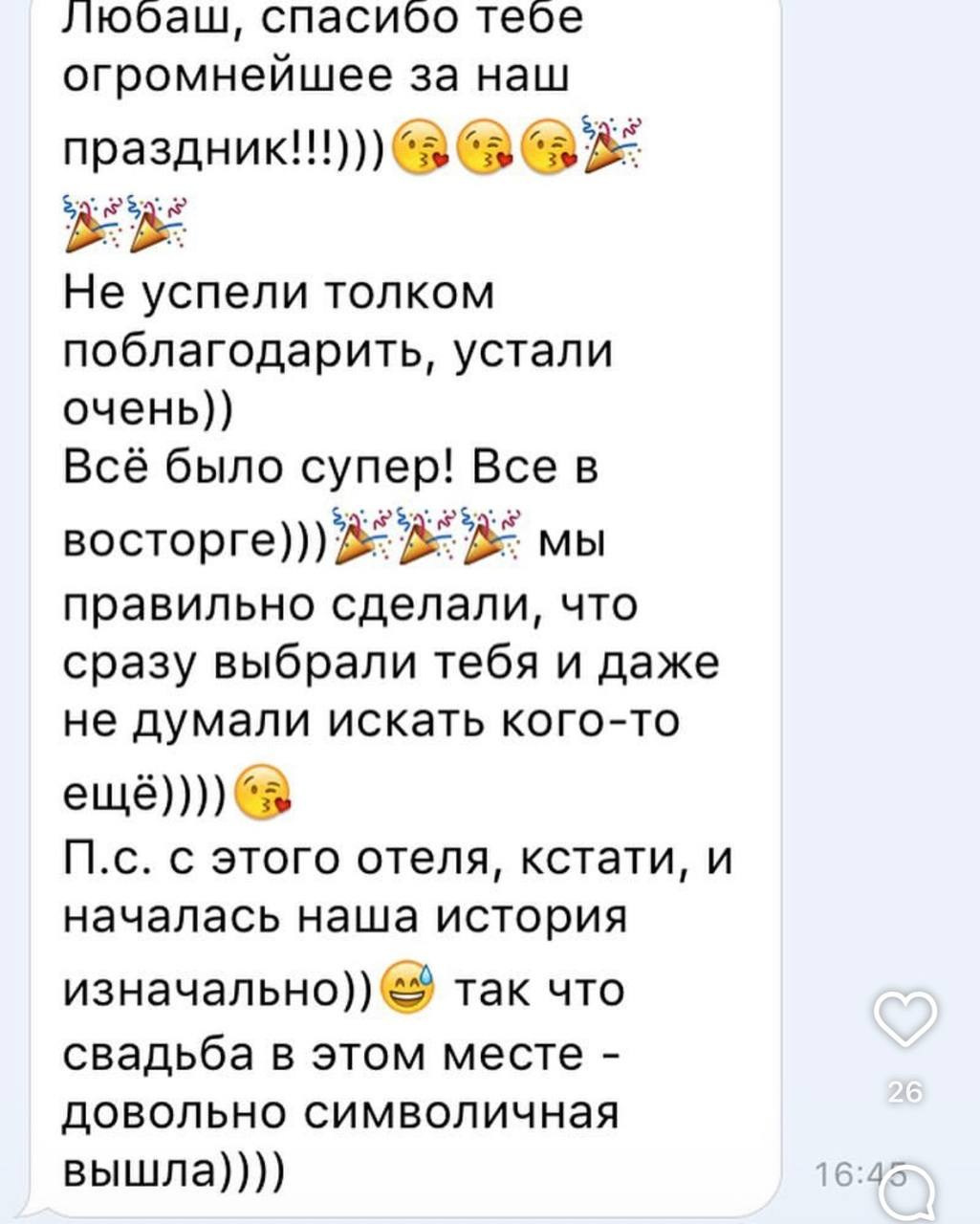 Любовь-самое неповторимое чувство на земле, у него нет одинаковых сценариев для всех влюбленных, так и у меня не бывает одинаковых сценариев (планов торжеств)ни для постоянных клиентов, ни для единождых заказчиков.