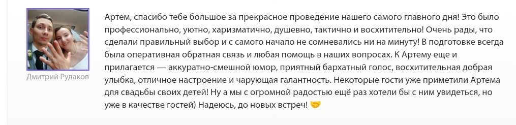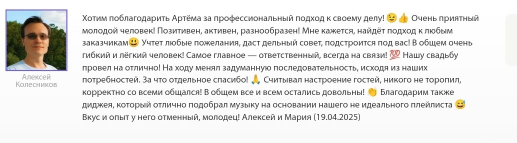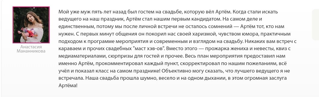 Всегда на одной волне с гостями. Не просто ведущий, а человек который найдет общие темы для незнакомых людей и создаст ту самую атмосферу.