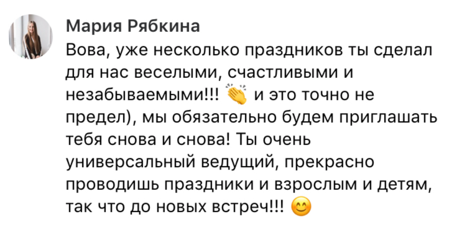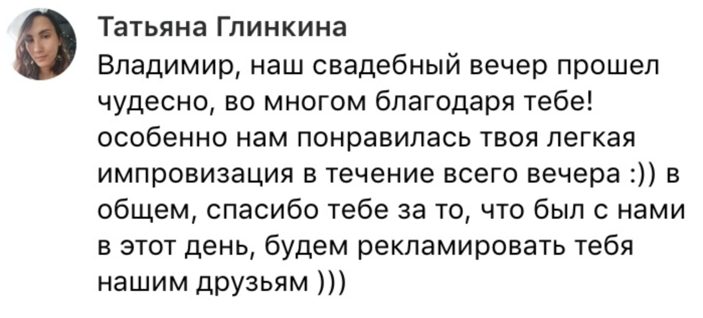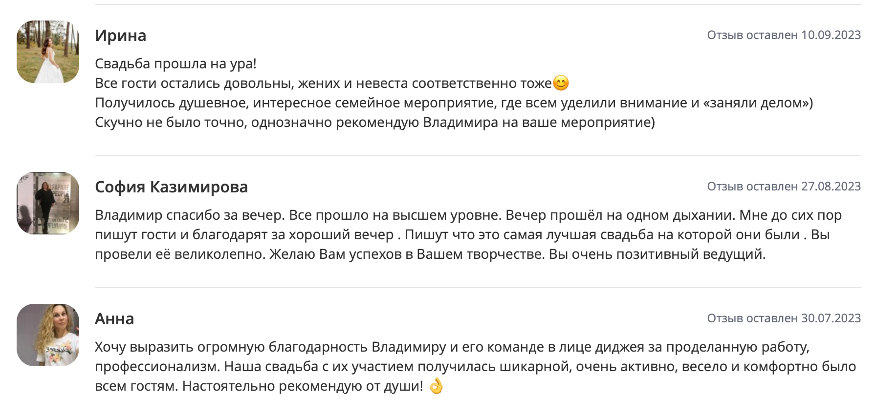 Я всегда открыт к диалогу и пожеланиям клиента, искренне заинтересован в том, чтобы все гости на празднике могли получить свою порцию удовольствия и внимания.