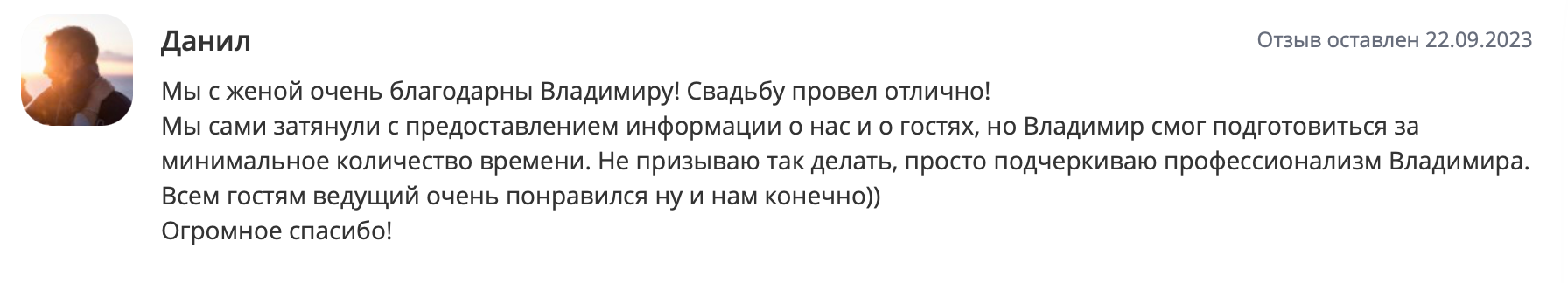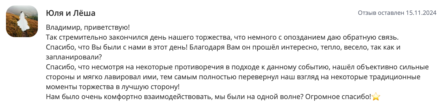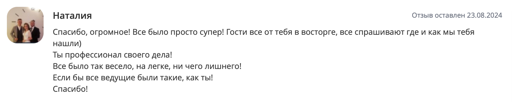 Верю, что каждый клиент выбирает своего ведущего по внутреннему отклику. Если это произошло — я буду рад стать частью важного события в вашей жизни.